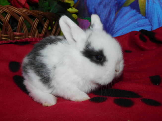 Sprzedam królika baranka mini lop samczyk bardzo ładny biały z ciemną obwódką wokół oka urodzony 19 maja 2025 ...